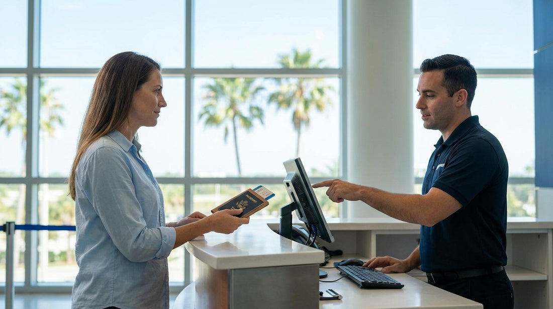 A customer hands their documents to an agent at a car hire counter inside the Orlando airport terminal