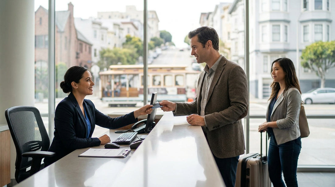 Person handing a credit card to an agent at a car rental desk in San Francisco