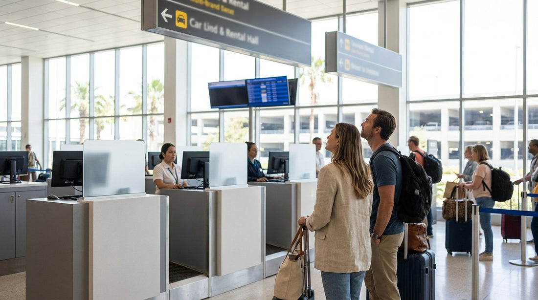 As you follow airport wayfinding, check that the signs you are following consistently refer to “Rental Cars” and not “Ground Transportation” generally. Once you reach the rental counter area, stop and orient yourself before joining any line. Rushing straight into the first queue you see is the main reason travellers lose time.
