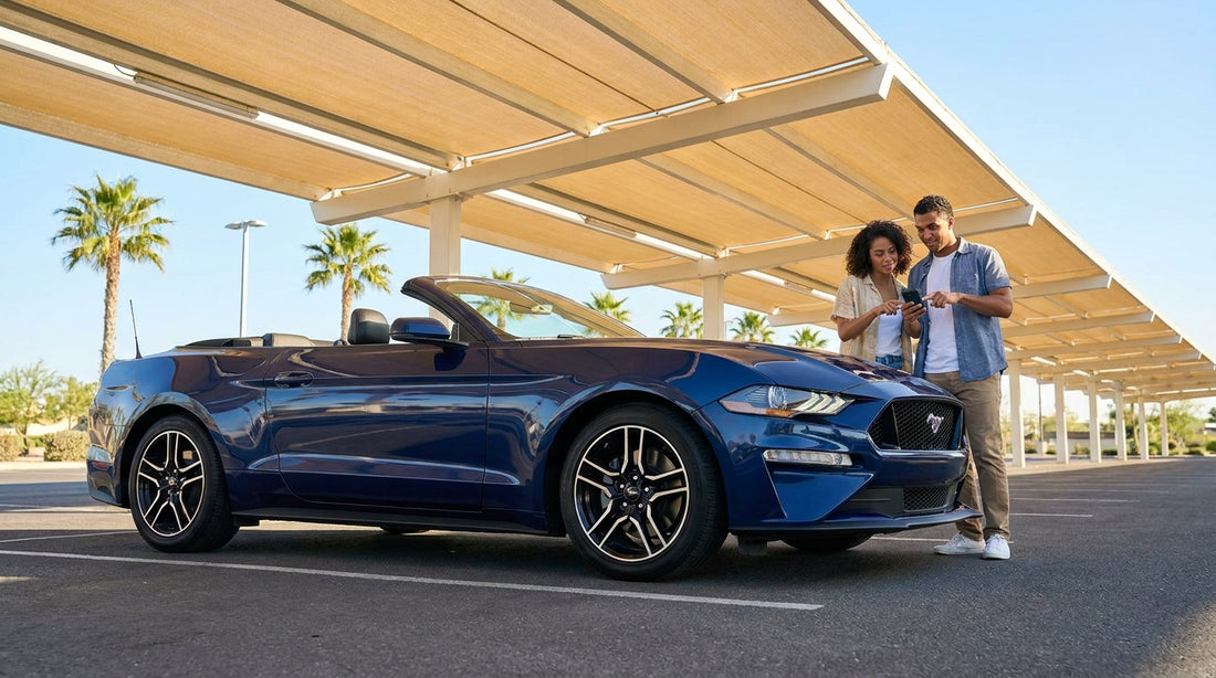 Person holding a smartphone displaying a map inside a car rental parked on a sunny California street