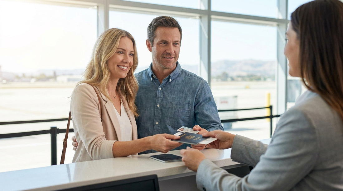 Traveler handing a passport and documents to an agent at a San Francisco car rental desk