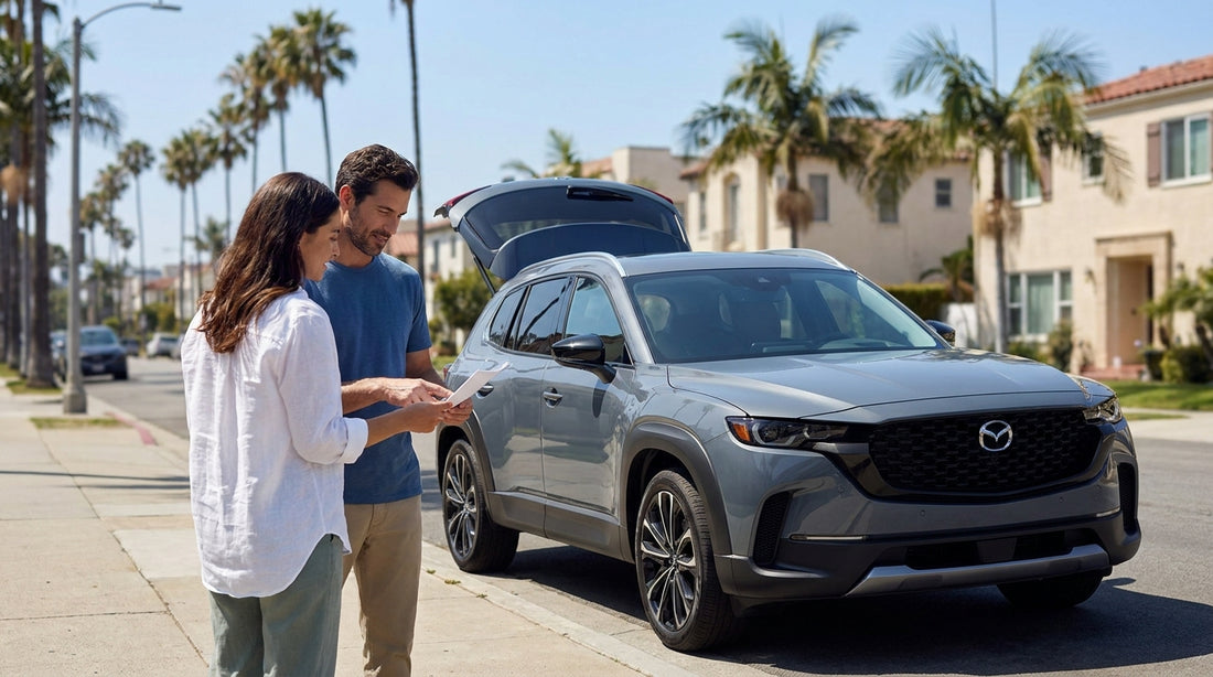 A person reviewing car rental documents on the hood of a white vehicle parked on a sunny street in Los Angeles