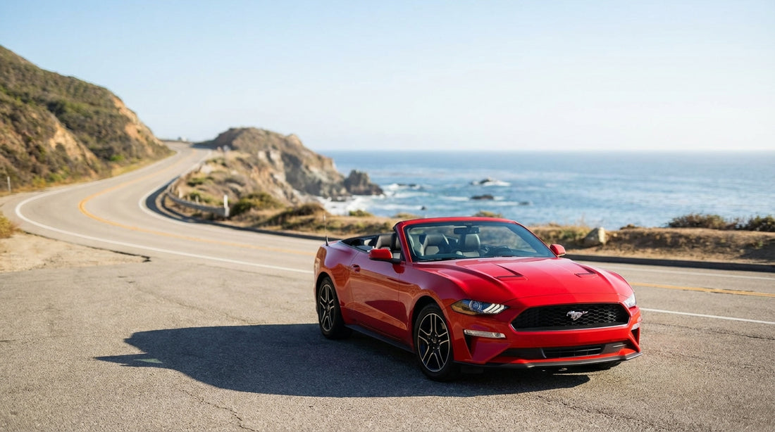 A convertible car hire drives down a winding coastal highway in California on a sunny day