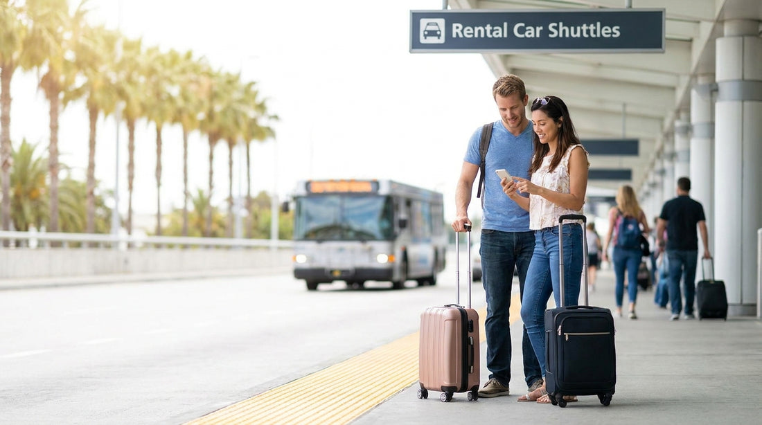 Waiting at a hotel shuttle sign. Hotel and private parking shuttles can be close by. Always confirm you are in the rental car shuttle area and that the bus branding matches your provider.