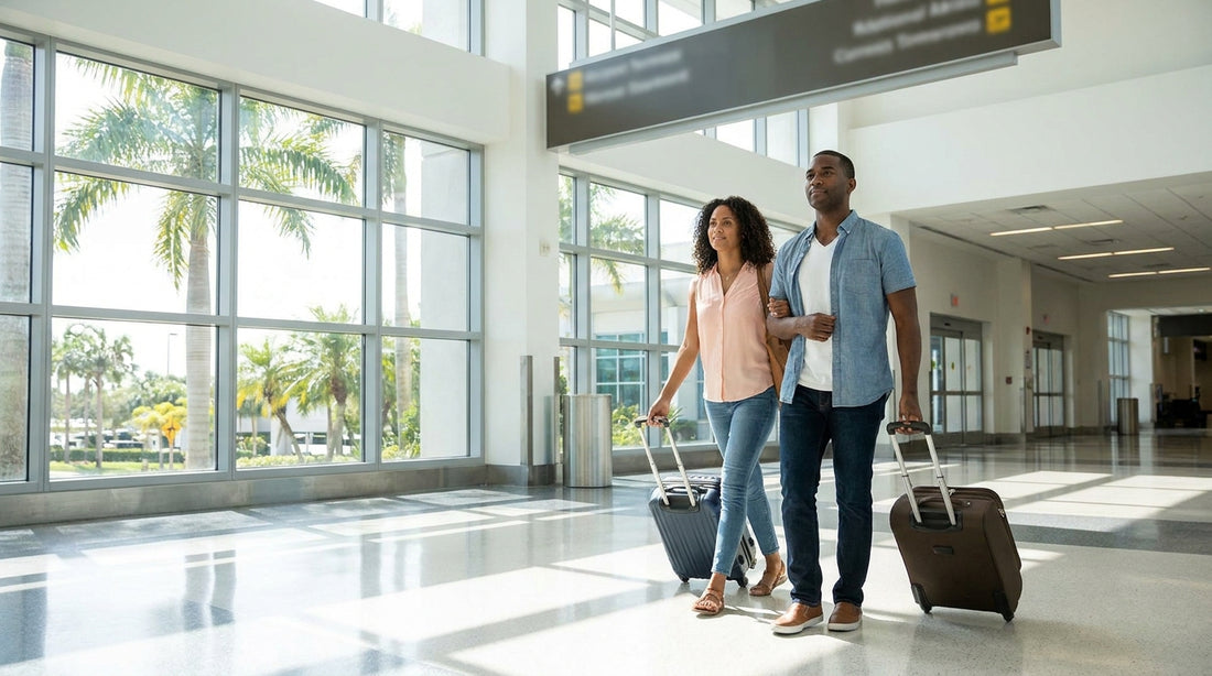 Traveler rolling a suitcase toward parked vehicles at an Orlando car rental garage