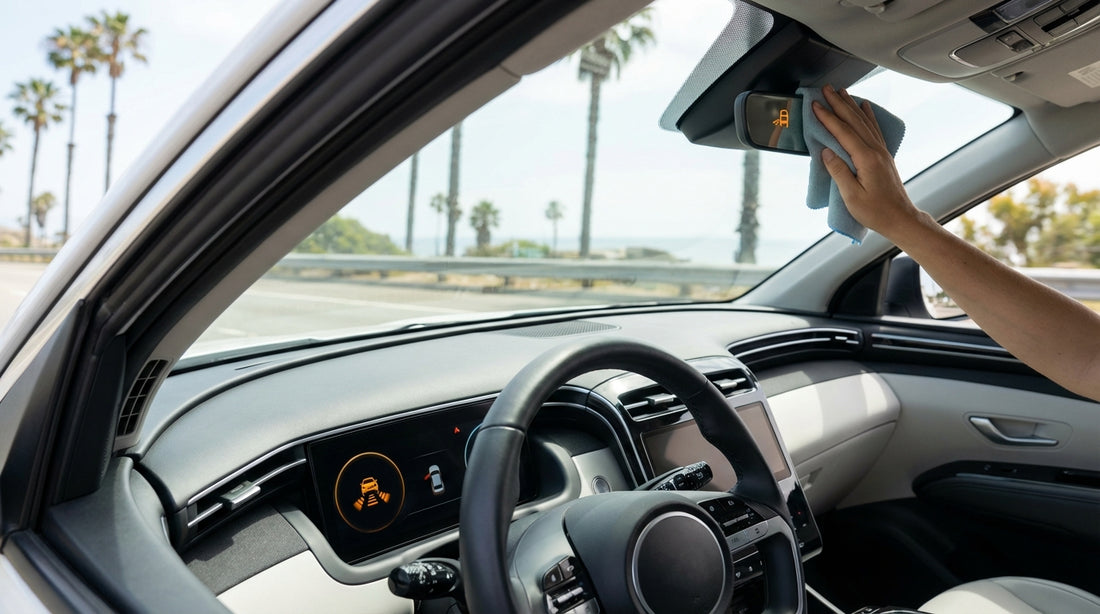 On drives near Joshua Tree, Palm Springs, or inland valleys, fine dust can accumulate and look “clear” to you but opaque to sensors. A damp cloth wipe on the emblem and bumper sensors is usually enough. If dust is heavy, check your cabin air settings too, as a dusty windscreen from inside haze can worsen camera clarity.