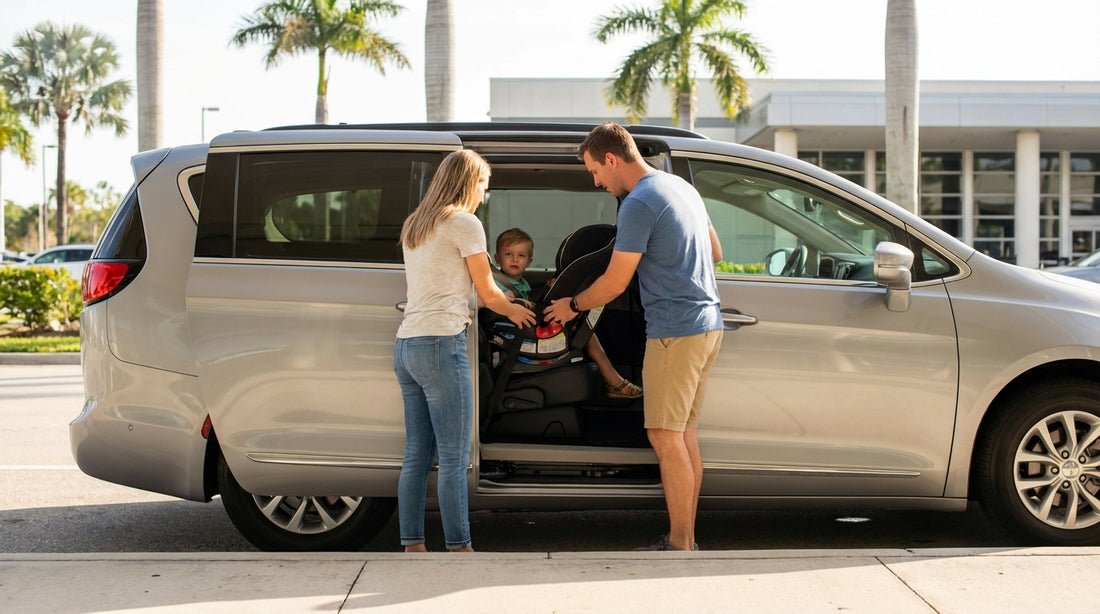 A parent installs a child seat in a car rental vehicle under a sunny Florida sky with palm trees