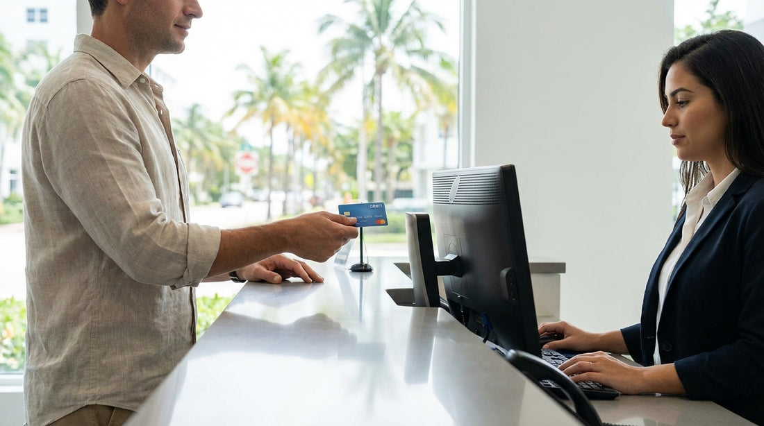 Most Miami desks require the physical Mastercard debit card, not a digital wallet version. Some terminals require chip-and-PIN, while others may use chip-and-signature. If your card is contactless-only without a chip, or your bank blocks foreign transactions, the authorisation can fail.