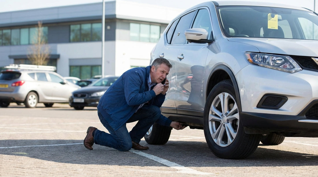 Take a wide video first. Walk around the vehicle and record a short video showing the surroundings, the parking bay or kerbside location, and any nearby signage or security cameras. Then record the dashboard with the ignition off and, if advised to start it briefly, record the warning lights and sound.