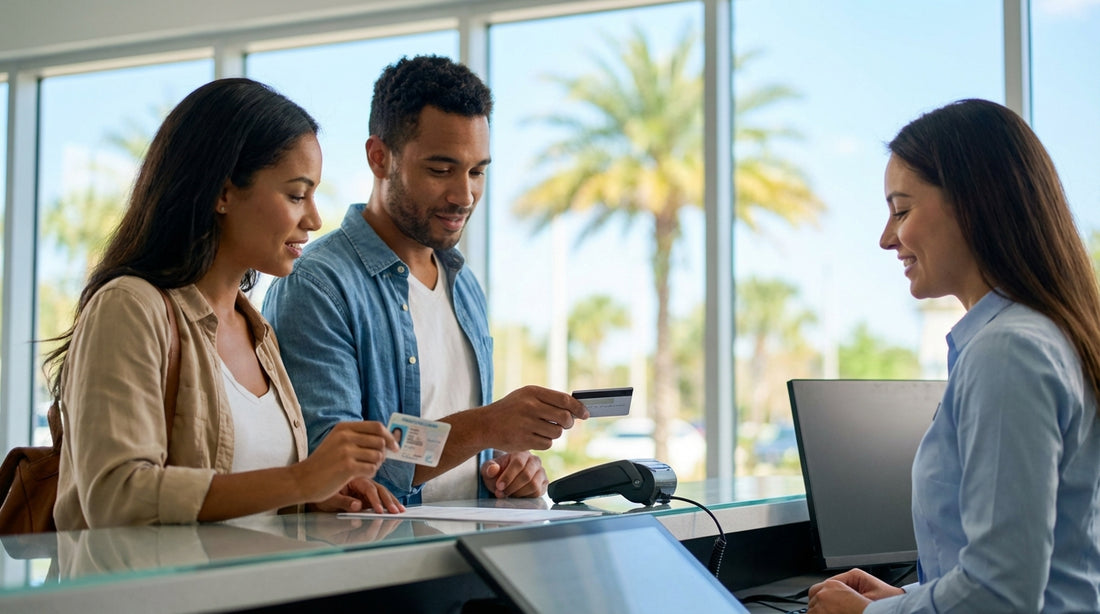 A couple at a rental desk completing the paperwork for their car hire in Orlando