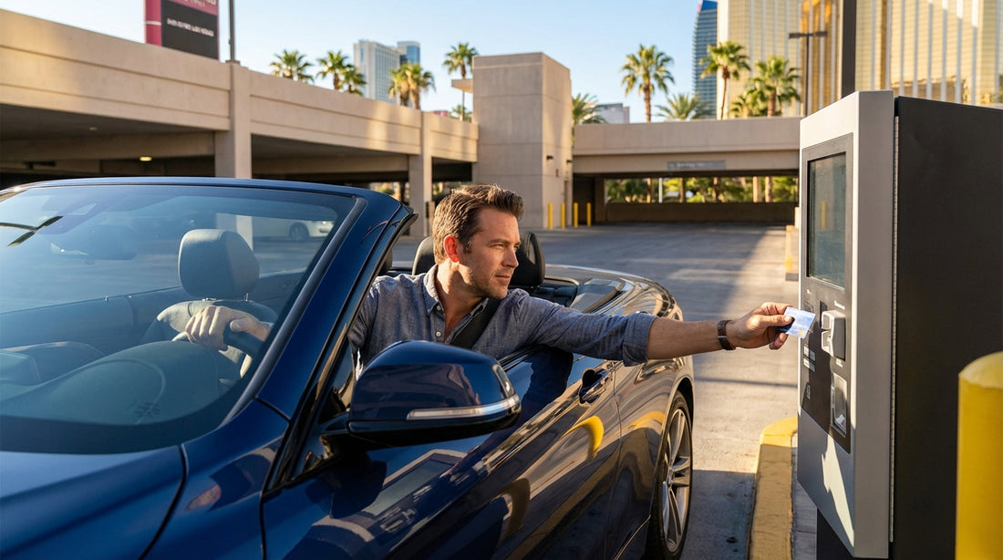 Large Strip-adjacent resorts operate multi-storey garages designed for high throughput. These are usually the most straightforward for travellers without US apps because they commonly support ticket-and-pay, pay stations, and card payment at the barrier. You park, take a ticket, then pay at a machine or on exit.