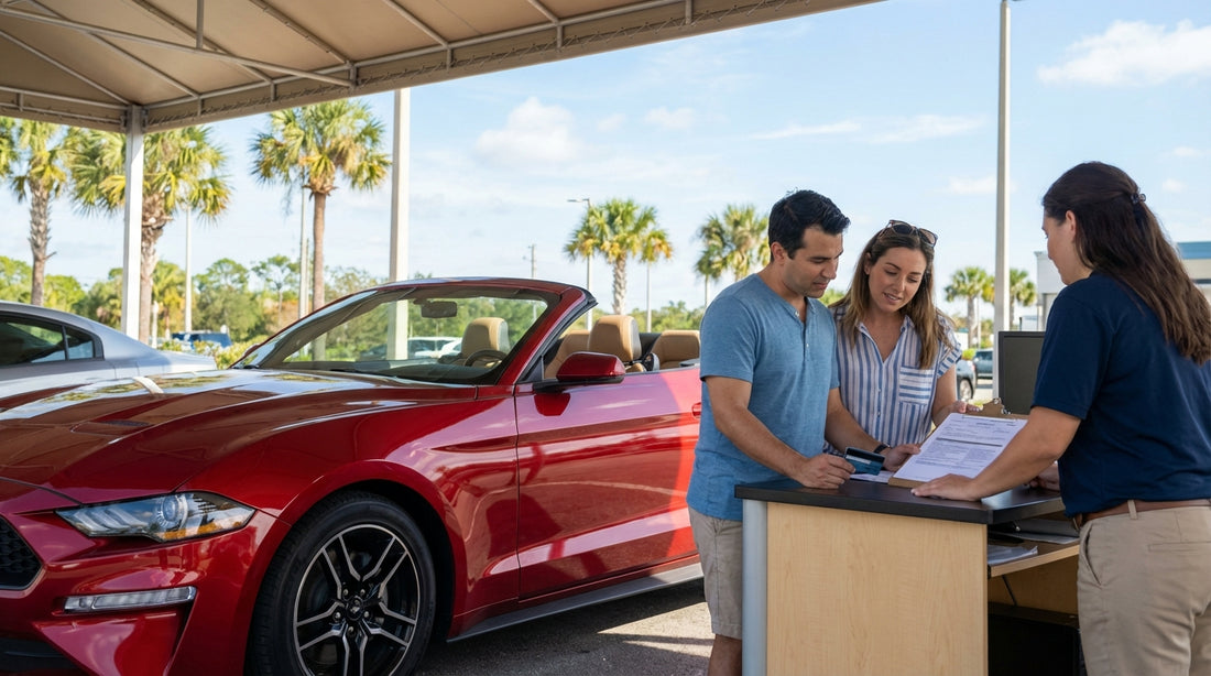 A convertible car rental driving down a sunny coastal highway lined with palm trees in Florida
