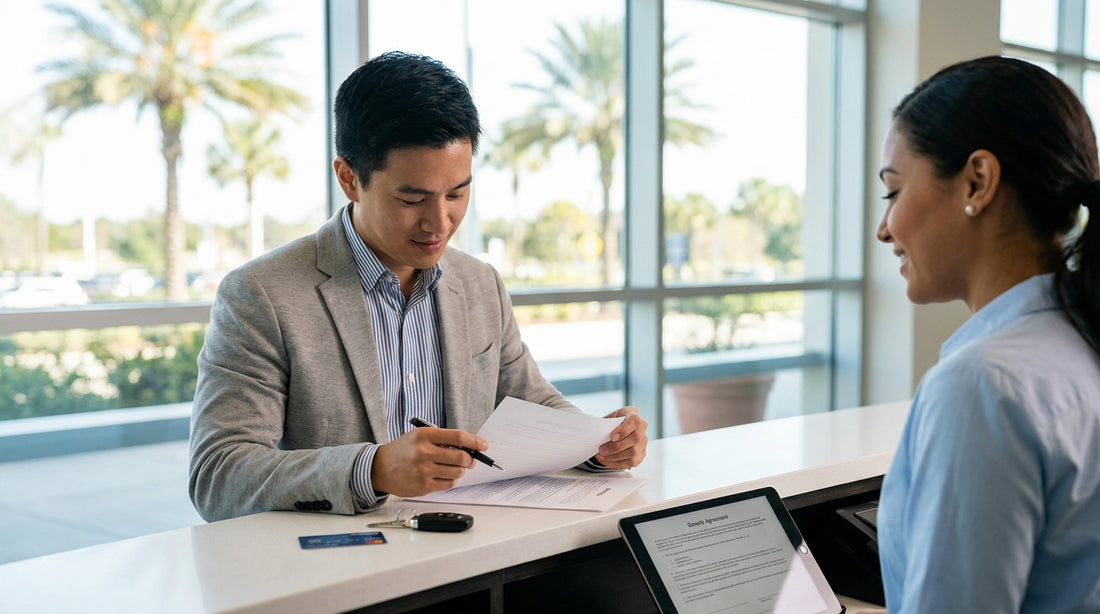 A man carefully reading a car hire agreement in a sunny Orlando airport parking lot