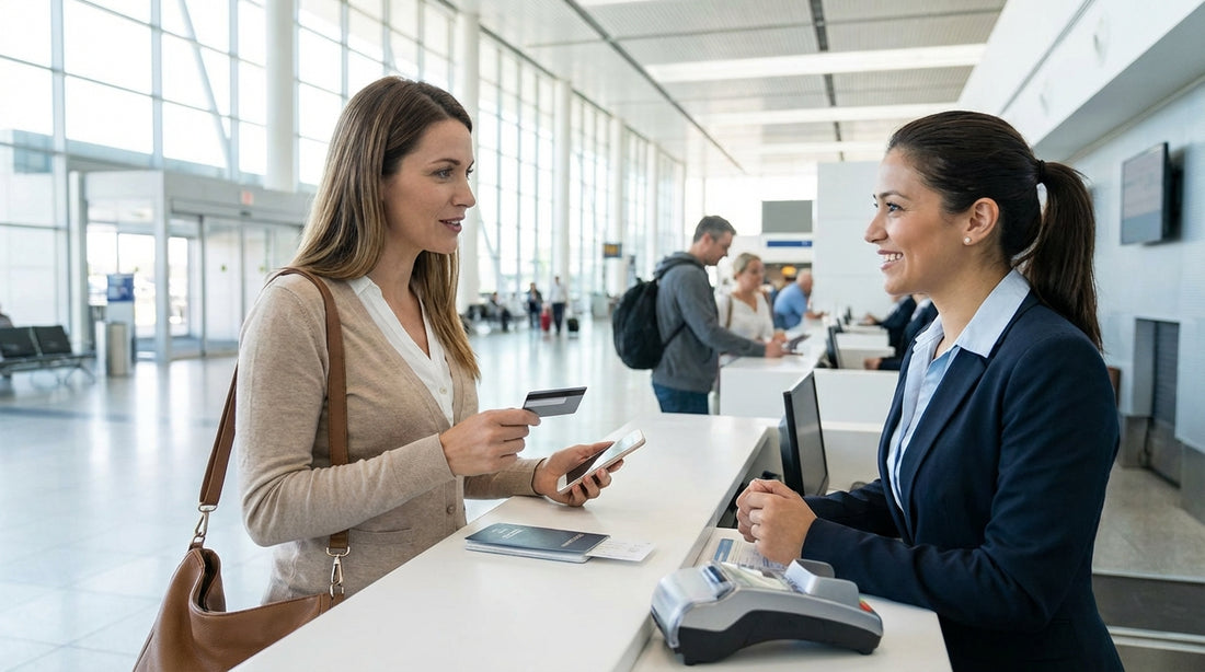 A person paying for their car rental with a credit card at an airport counter in the United States