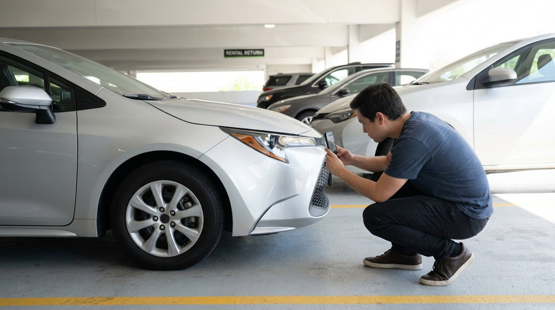 Most disputes relate to exterior scuffs, dents, scratches, and paint transfer, especially on corners and low areas. Photograph the car in a loop, starting at the front left and moving around clockwise, so you do not miss anything.