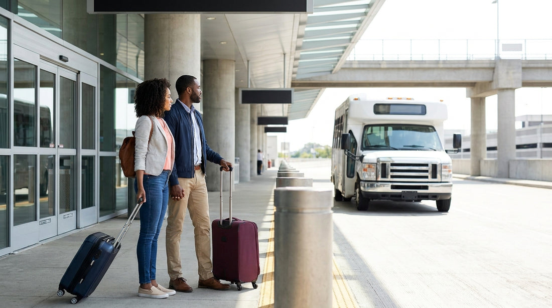 Travel light to the kerb if possible. If you are in a group, consider sending one person to find the shuttle stop while others wait with luggage inside, where it is less crowded.