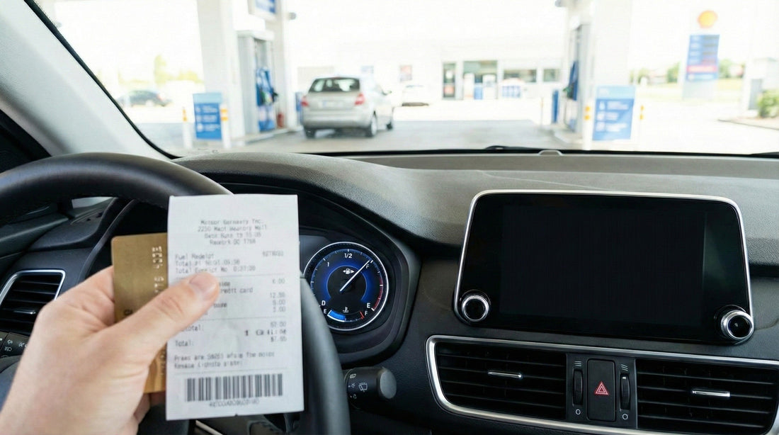 Driver holding a gas receipt near the dashboard fuel gauge during a New York car hire return.