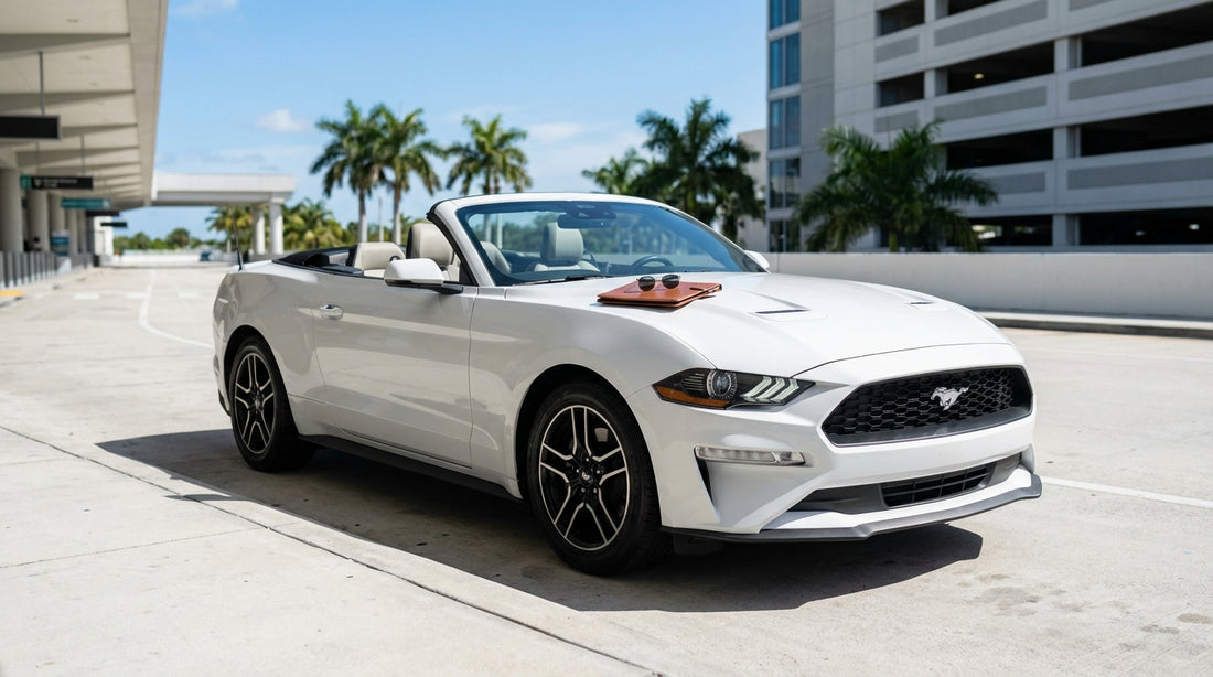 A stylish car hire convertible parked along a sun-drenched Ocean Drive in Miami with palm trees