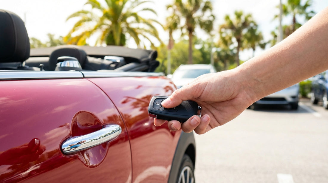 A hand holding a key fob to unlock a car hire vehicle in a sunny Orlando lot with palm trees
