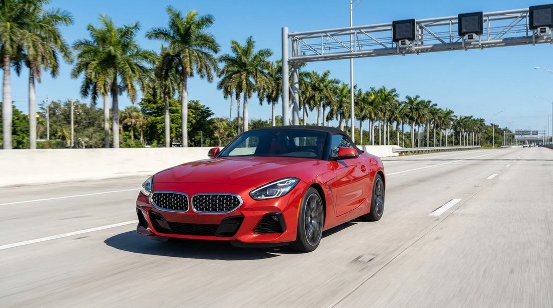 Modern car rental driving under a highway toll gantry in sunny Miami