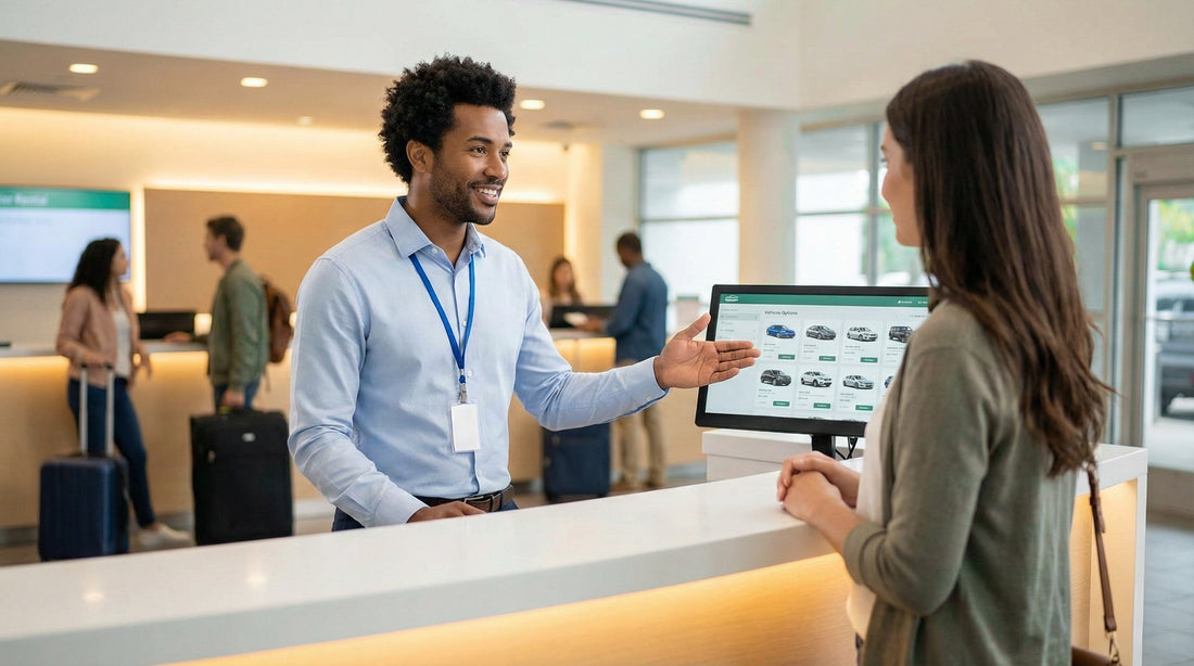 A customer at a bright car rental counter points to a specific car model on a digital screen while talking to an agent.